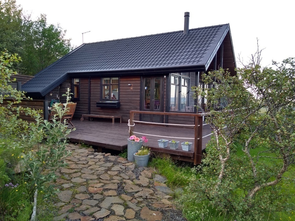 My hut in Efsti-Dalur is my favorite house in this world. Up the mountain, 200 m, and you have the most wonderful view over the volcanic mountains - Hekla, Tindfjöll and Eyjafjallajökull (2010). Spend the evening in a hot jacuzzi, warm geothermal water, the house is always warm when you get there - it is simply wonderful.