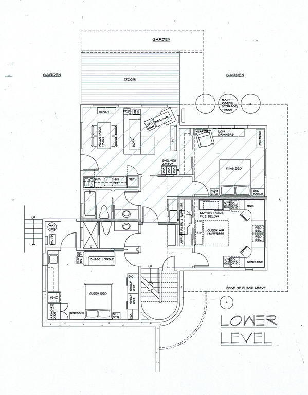We are a family of 4, but our daughter now lives on the East Coast with her partner. Our adult son David (26) lives with us now in our downstairs separate apartment (that can be opened up as an integral part of the house when he is gone). When he travels with us, the entire house is available, otherwise the area that is hatched in the lower level plan is not available. My husband and I are moving towards retirement from our architectural practice, still doing a few small projects while Bob is writing a book (a mystery novel set in the Bay Area), and Christine is currently serving on the Pacifica City Council as Mayor, which takes up most of her time.