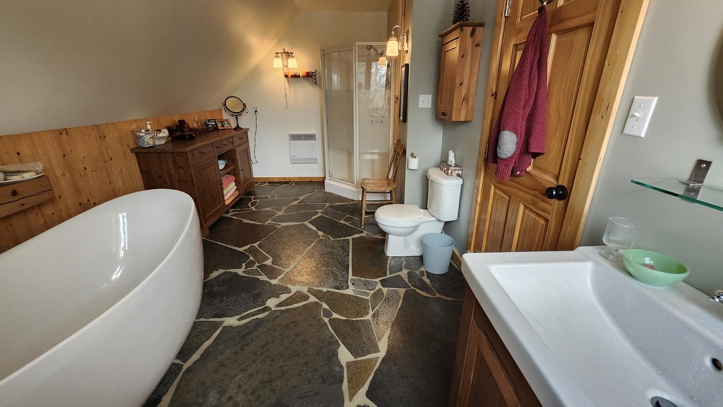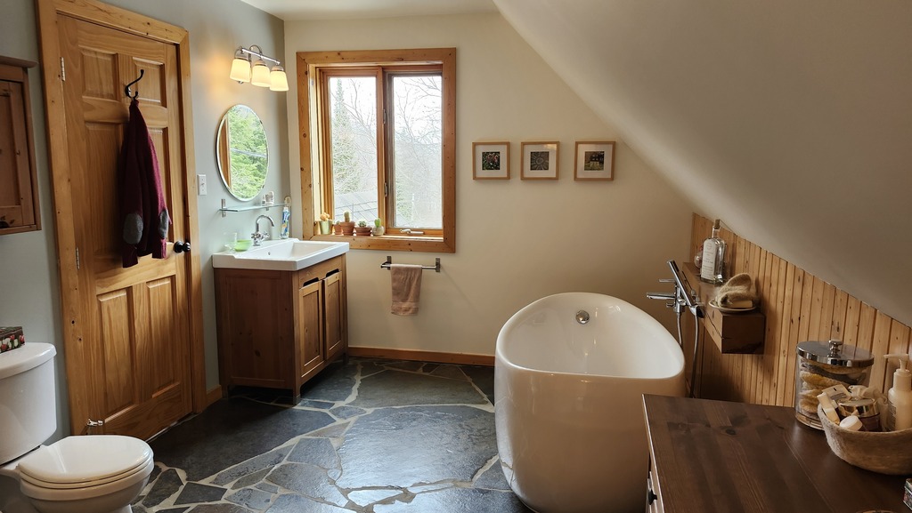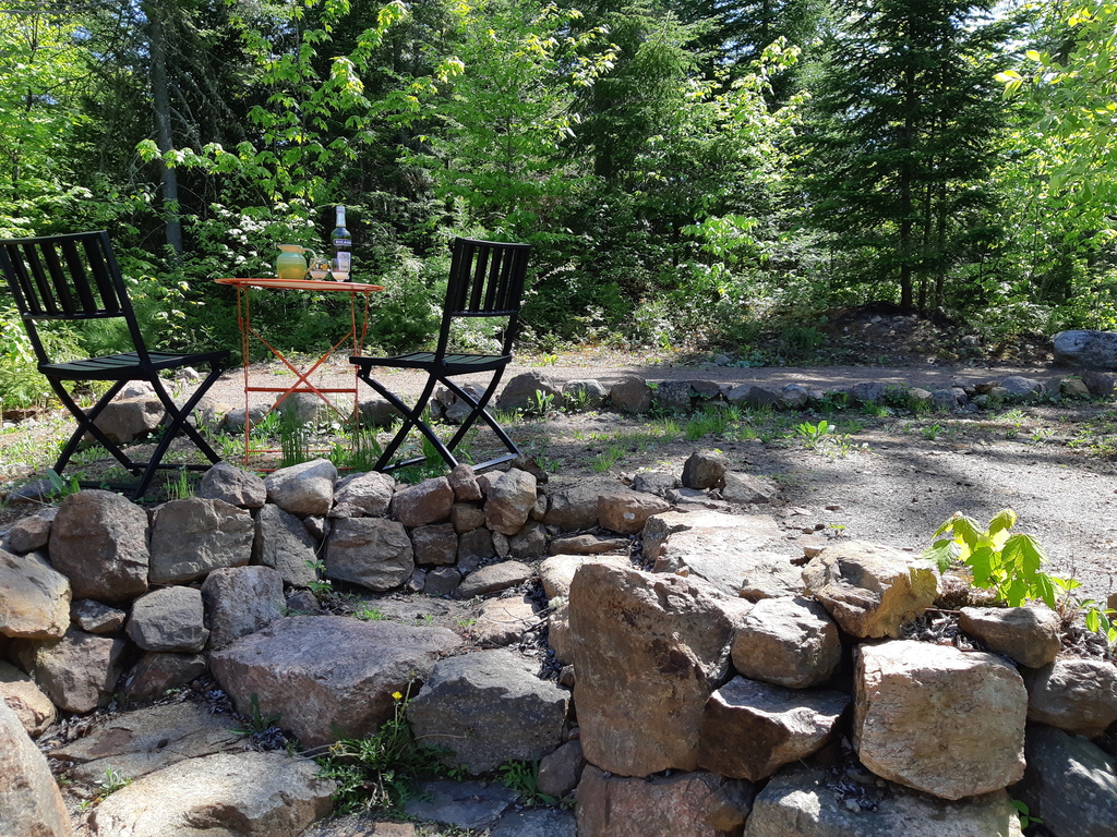 Nous sommes souvent dans nos sentiers ou sur le bord du feu, nos activités préférées. Guy est souvent dans notre forêt à couper le bois pour l'hiver ou à bizouner des projets artisitques dans son nouvel atelier, encore en construction. De mon côté, je lis dans la véranda en été, je suis en raquettes sur nos sentiers en hiver, je cuisine ou je caresse le chat!