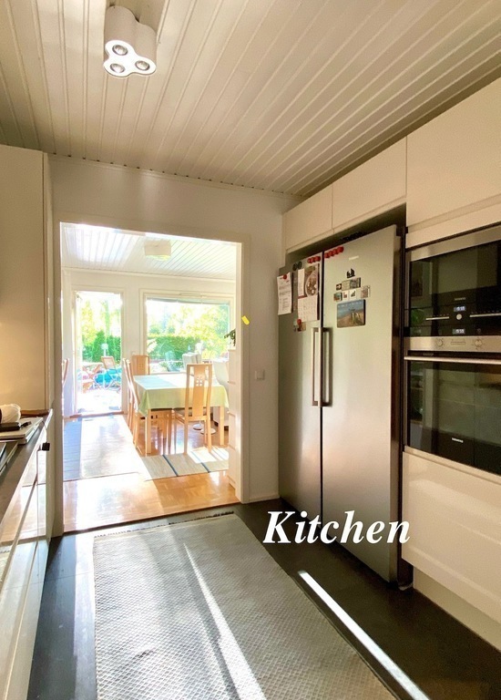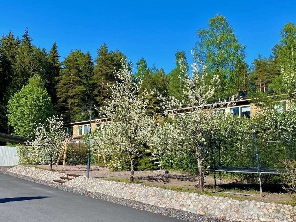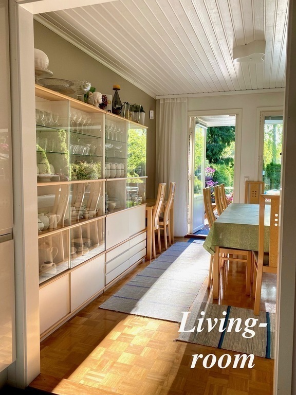 We live around 30 kilometers from the center of Helsinki in Tuusula in a row of  six houses.  The area is quiet and green. In the back we have a lovely courtyard and terrace facing west, where you can enjoy the sun from morning to evening. The sun rises very early and sets very late in June and July.