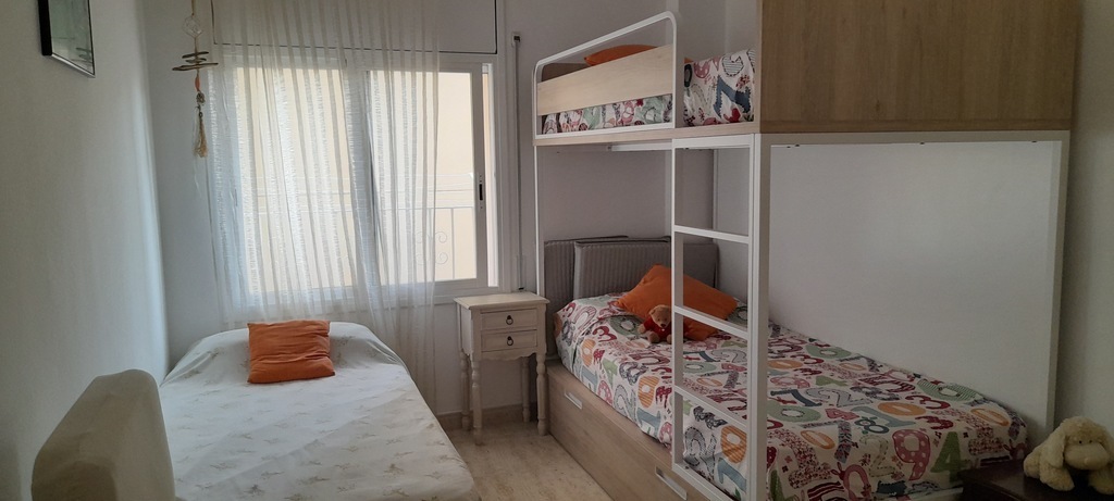 Hi ha una habitacio de matrimoni amb un llit doble. A l?habitació del costat hi poden dormir 3 nens i si despleguem un llit-niu 4. Al menjador si fa falta hi poden dormir 2 persones més amb un sofà-llit. La recomanació ès no emplenar l'apartament amb 8 persones perque es petit , millor no haver d'ocupar el menjador .