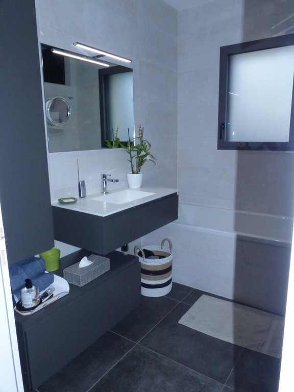 Notre maison neuve comprend une grande pièce de vie de 60 m2 avec une cuisine aménagée, 2 chambres avec 1 salle de bains dans la partie nuit et 1 chambre/bureau avec un canapé convertible neuf avec une salle d'eau attenante. La pièce de vie donne sur une grande terrasse (40 m2)disposant d'une pergola bioclimatique qui peut s'ouvrir ou se fermer en fonction de l'ensoleillement. Notre jardin donne sur un champ ce qui permet de profiter d'un joli paysage. Il n'y a aucun vis à vis sur notre maison, les murs à l'entrée permettre de conserver notre intimité.