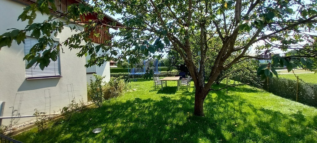 In summertime there is a big trampolin in the garden. We do not have the most beautiful garden, as our- and your children also -are allowed to play football and to romp around as they please.