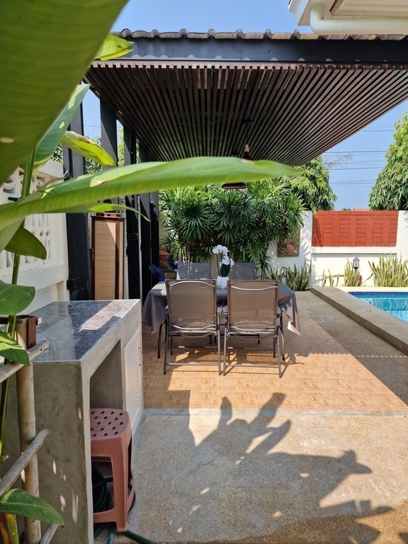 Tropical Sea View Village is just one block away from a wide sandy beach. The community features a large swimming pool with a jacuzzi, a clubhouse with table tennis, a pool table, a small gym, a garden, BBQ area, and a shared community space.