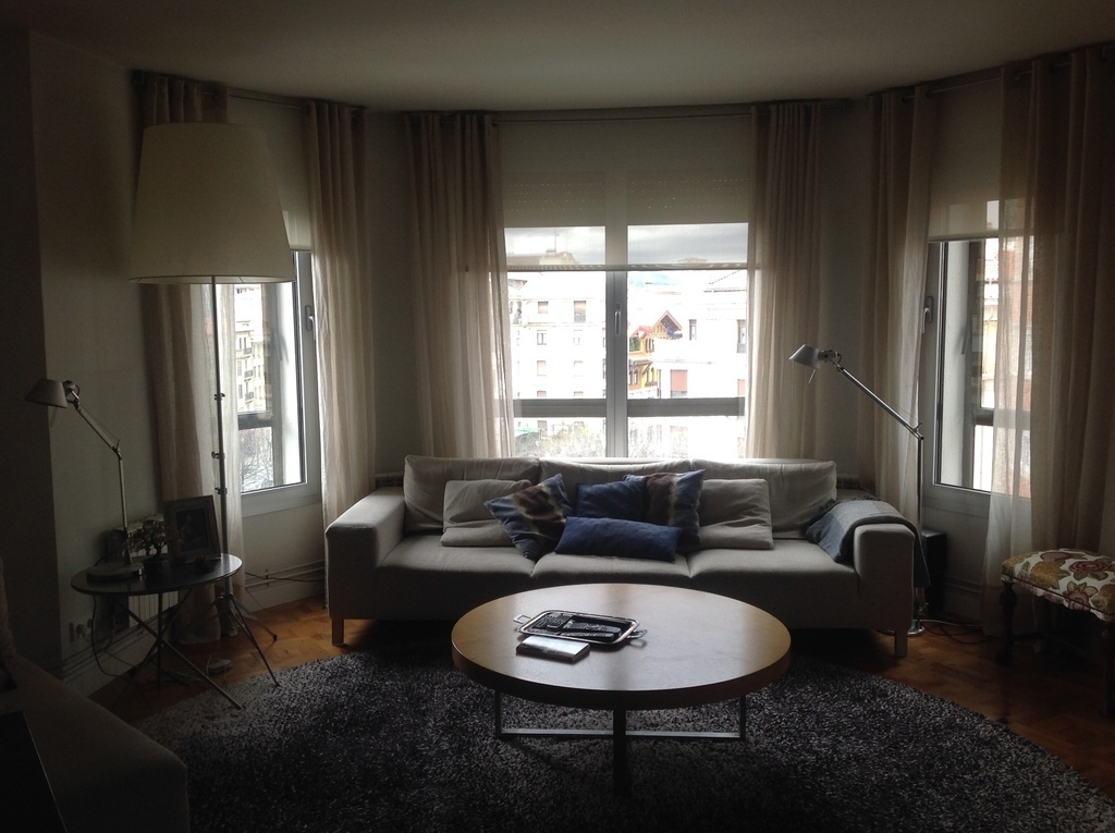 Nuestra casa está en la 5 planta de 8 pisos con ascensor de un edificio del año 1950, rehabilitado. Tiene salon, cocina comedor, 4 habitaciones y 2 baños, con una terraza tendedor en la cocina y 4 balcones exteriores, dos de ellos a la plaza. La superficie es de 150 m2. Tenemos plaza de garaje subterráneo a 200 m. de la vivienda.