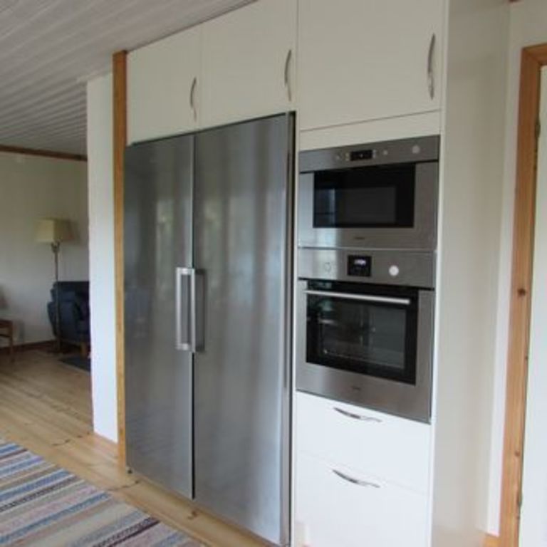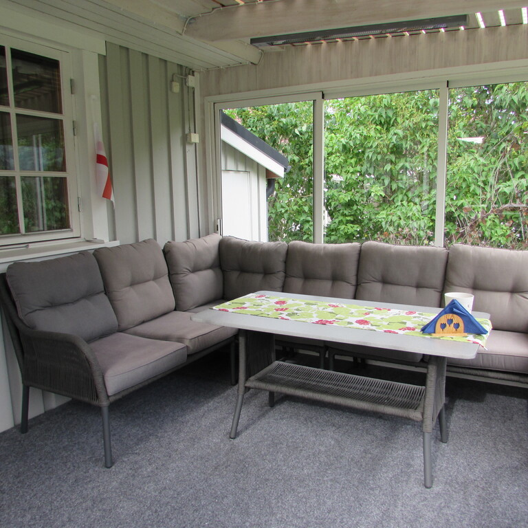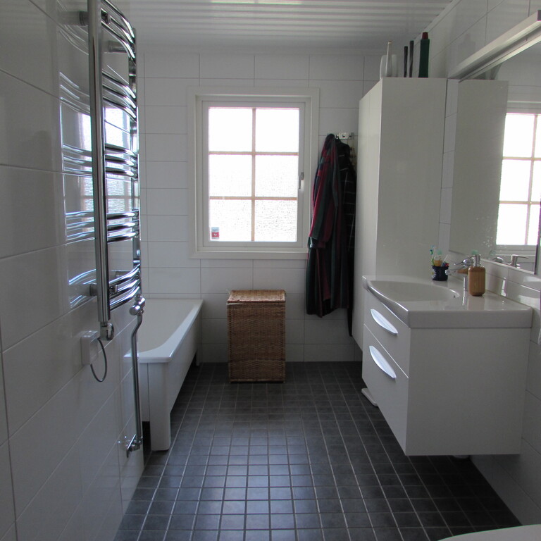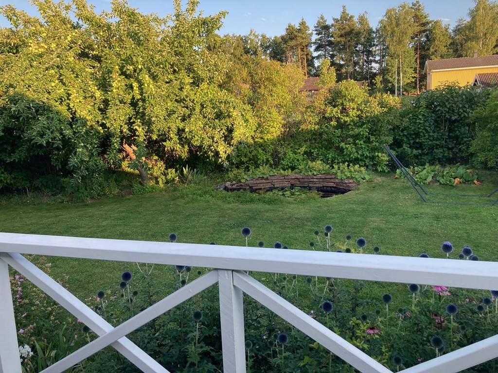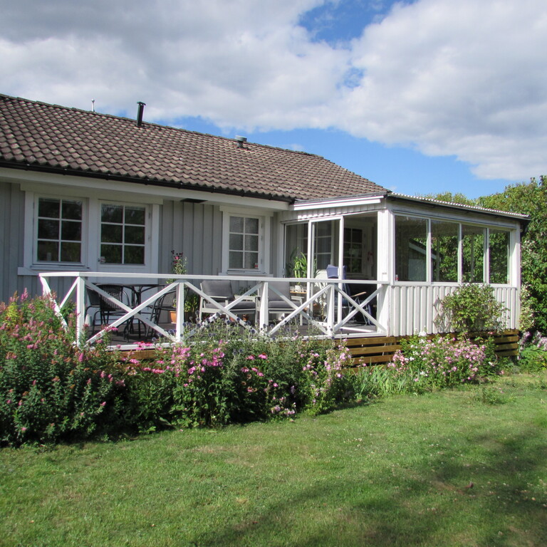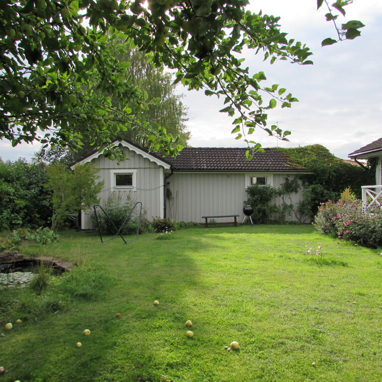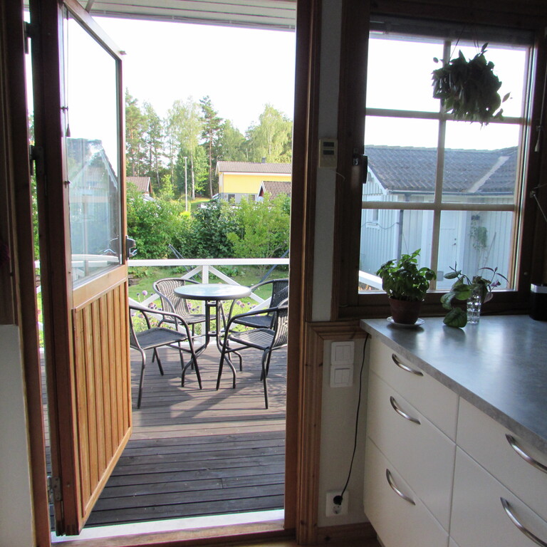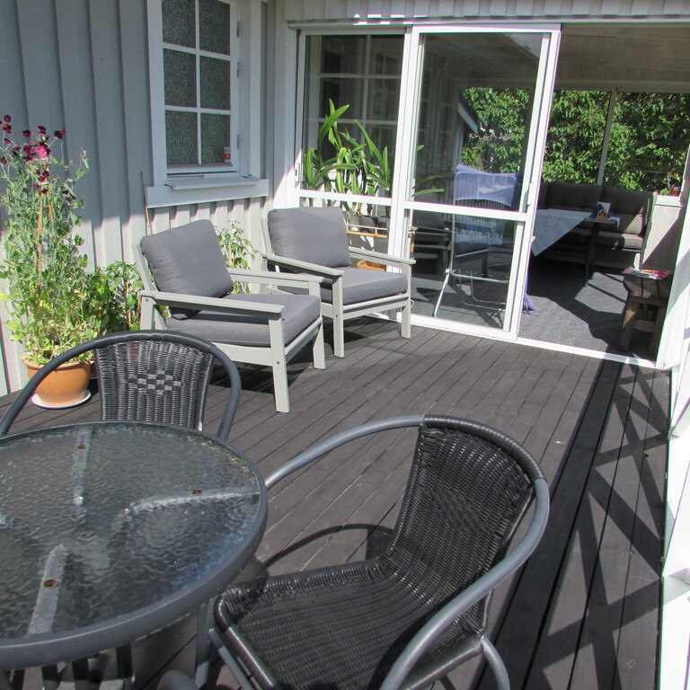 On the groundfloor you find a master bedroom, a bedroom with a single bed, a study, kitchen and livingroom and also a bathroom with bathtub. From the kitchen you go straight out to the terrace facing southwards. There is also a covered verandah where we love to eat our meals during spring, summer and autumn. It is our best room especially during the long Swedish summer evenings.