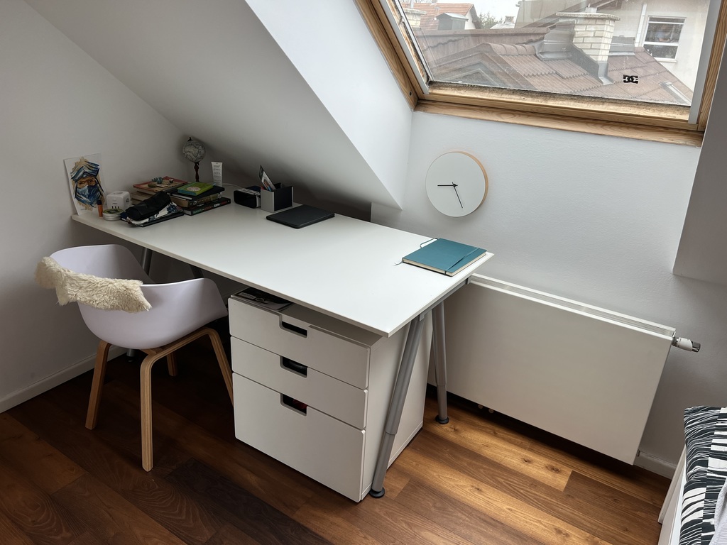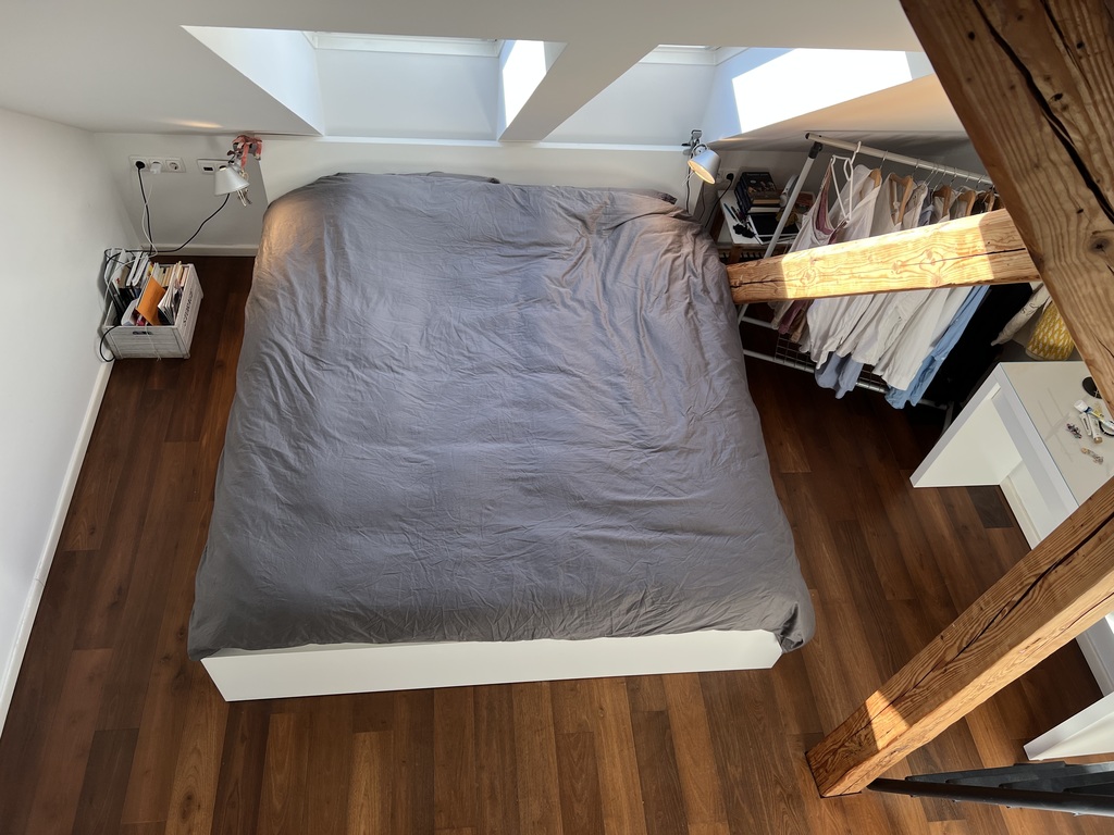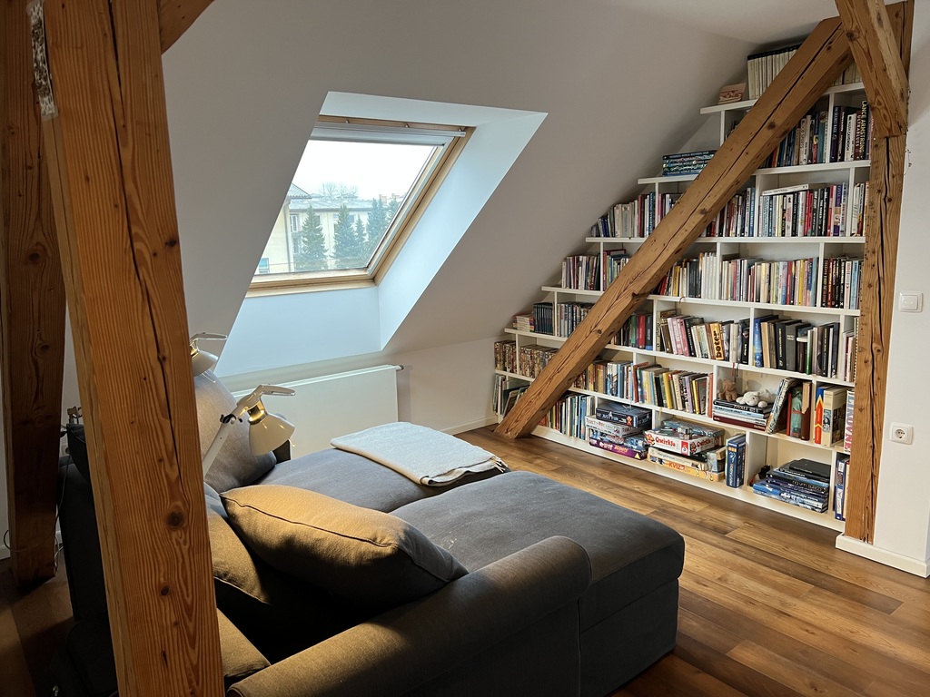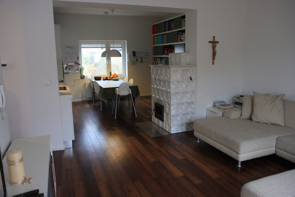 We live in semidetached house (build in 1943 and fully renovated in 2009), with two apartments. Our apartment is on the first floor and has two levels. In the first level there is a large living room with kitchen, dining area and bathroom with toilet. From this level there is also access to the 35m2 large terrace (with grill). In the second level there is open space with couch and library, one master bedroom with king size bed (1,80mx2,00m) and son's room with double bed (1,40mx2,00m), suitable for two smaller kids or one teenager.