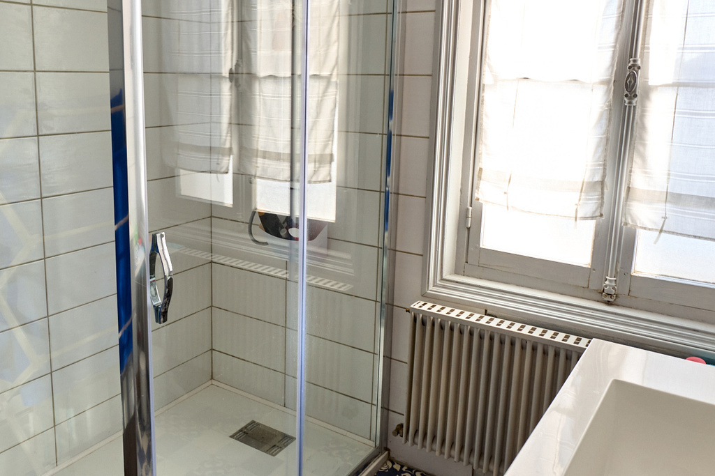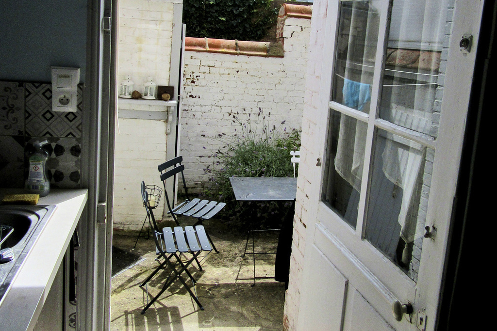 The ground floor is bright and airy, with east-west windows on both sides of the house. It comprises the living room with flat-screen TV (a wired connection is available for DTT reception with some news channels while we wait for the fibre connection, which is imminent) and DVD player with some DVDs, the dining table and opening onto a spacious, fully-equipped kitchen (fridge/freezer, oven, ceramic hob, Nespresso coffee machine, kettle, dishwasher, microwave, mini food processor, etc.). A small courtyard of 10 m2 to the rear of the kitchen allows you to eat outside in summer.
