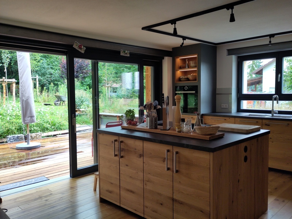 We have a big kitchen connected with the living room with huge windows to the big terrace and garden.