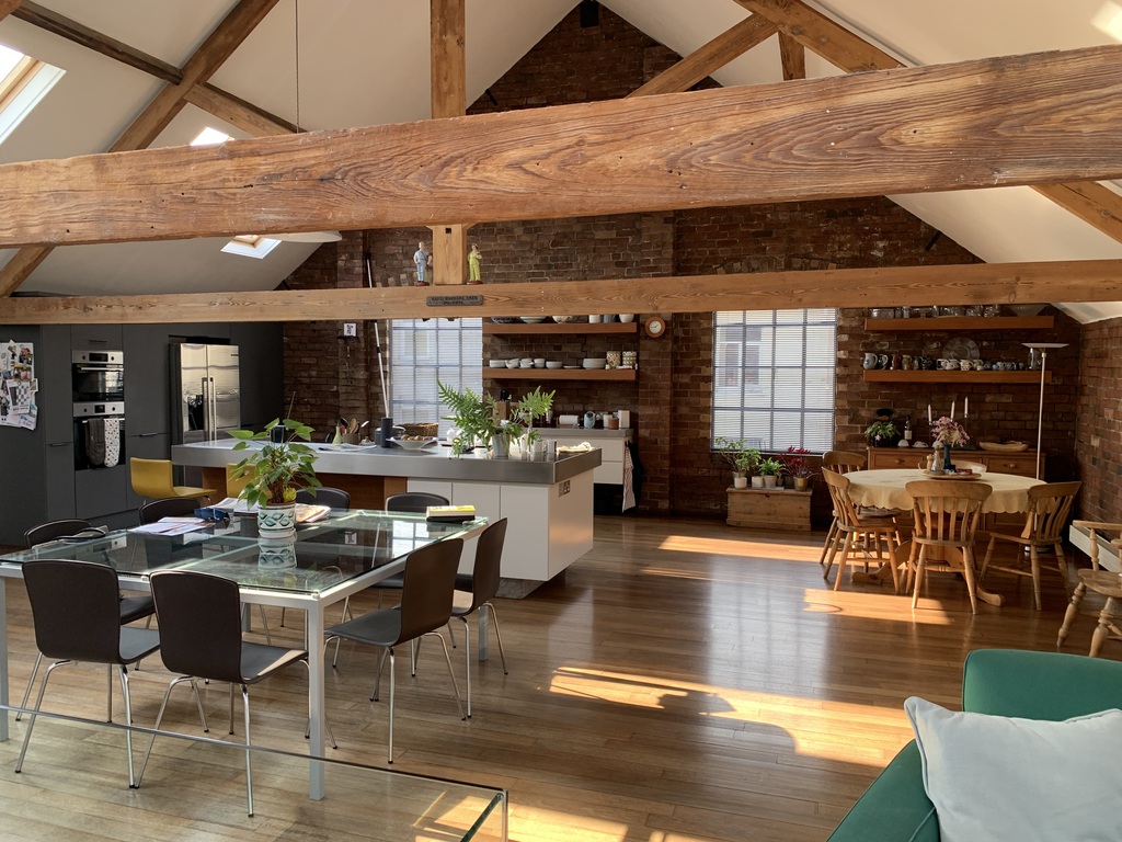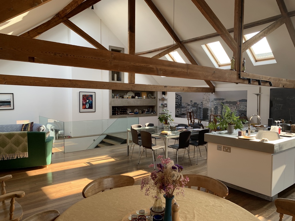 We live in an unusual house which has 2 large living rooms, one with the kitchen and one with a projector to show films etc The bedrooms are spacious and we have 2 bathrooms, both with showers and one with a bath also. There is a study and utility room too.A roof terrace and courtyard provide outdoor space and there is a park near by.Bristol is a lively city with many museums, art galleries, restaurants and lots of interesting places for children, including a science museum, an aquarium and a zoo.