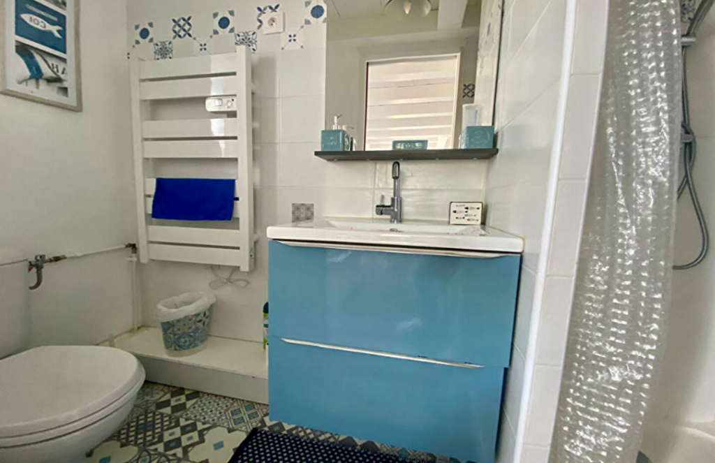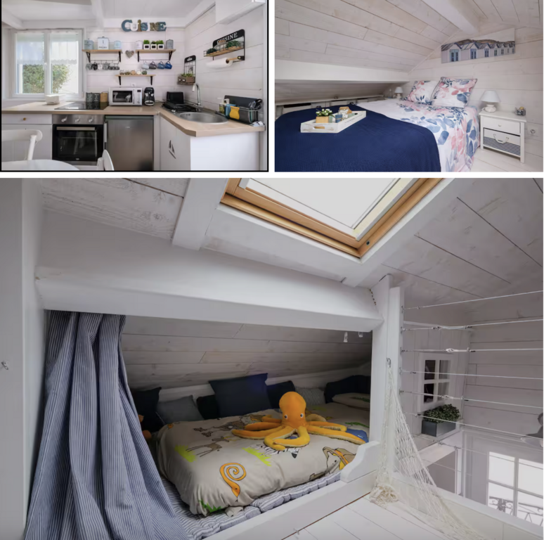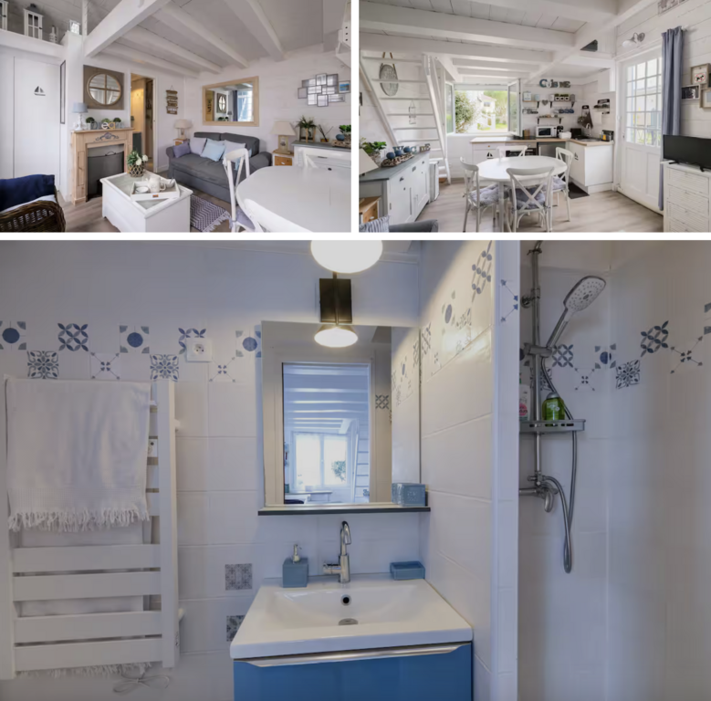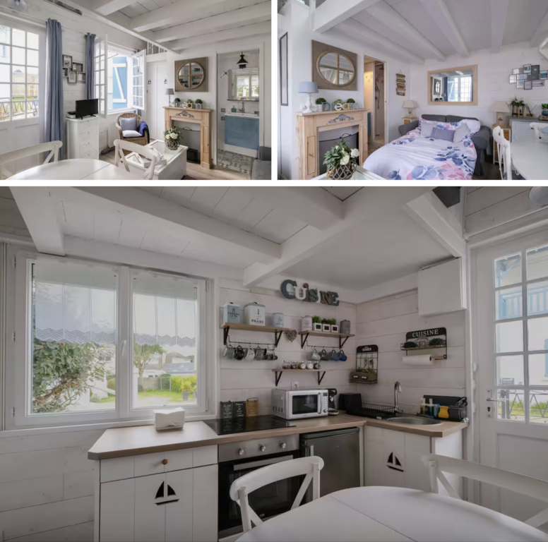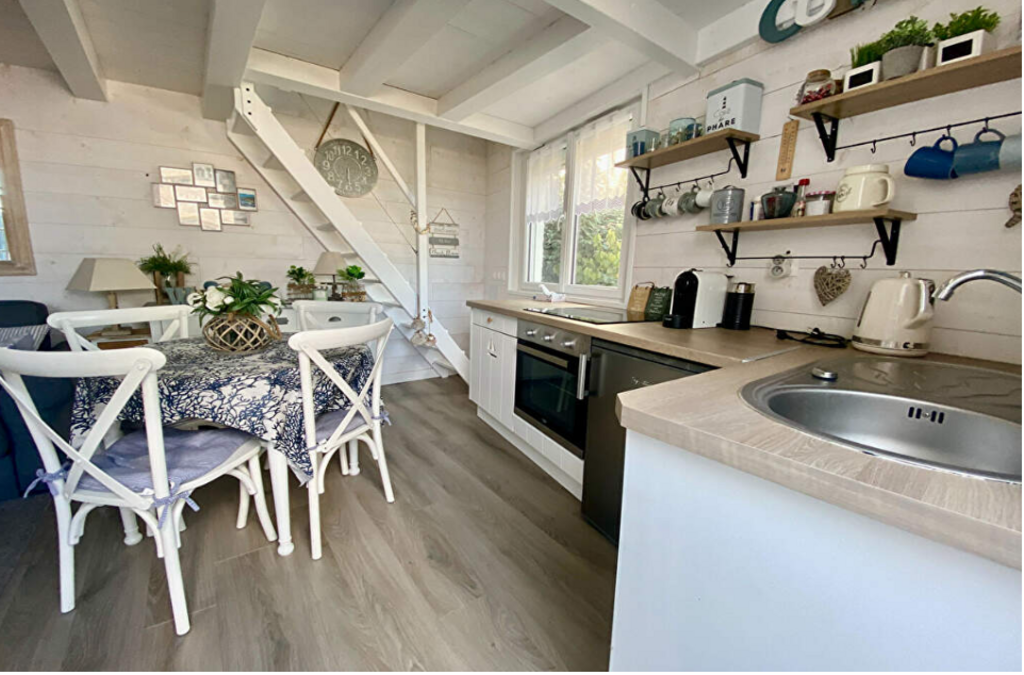 Il y a une cuisine ouverte équipée avec four, micro-ondes, petit réfrigérateur, machine à café Tassimo, grille-pain, plancha, bouilloire. Une pièce de vie avec une table, 4 chaises, un canapé convertible en canapé lit (160cmx190cm), un fauteuil et une télévision. Une salle d'eau avec une douche, sèche serviette, vasque et WC