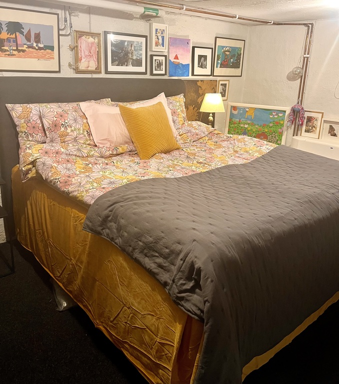 The upper floor includes two bedrooms—one with a double bed and the other with a 140 cm bed—as well as a second full bathroom with a shower. The basement level offers an additional bedroom with a double bed and a fully equipped laundry room with a washing machine, dryer, and drying cabinet.