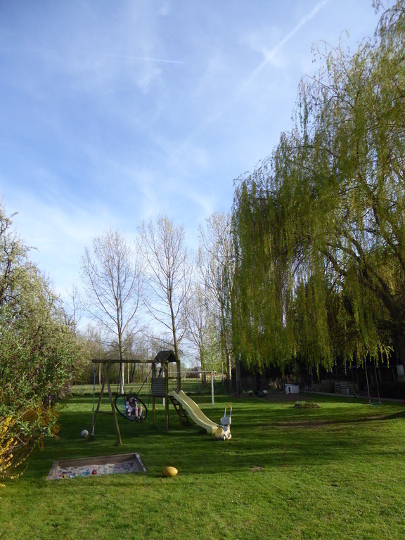 * grand jardin entièrement clôturé, orienté au sud avec terrasse, balançoire, bac à sable, trampoline, piscine en été, potager, goal, poules, écureuils, hérissons