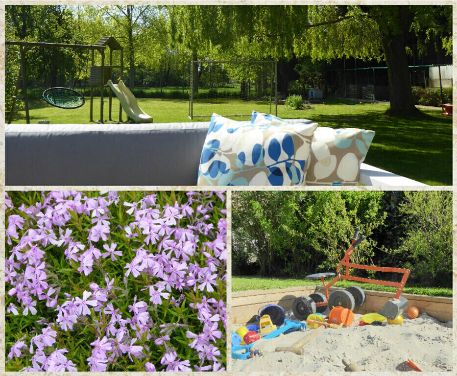 * grote, zuidgerichte tuin met zandbak, goal, moestuin, terras, zwembad in de zomer, trampoline, schommel, eekhoorns en egels