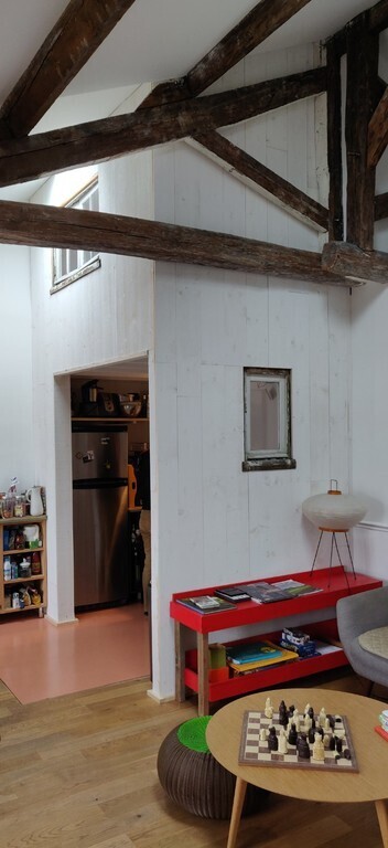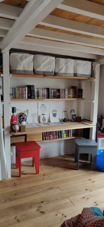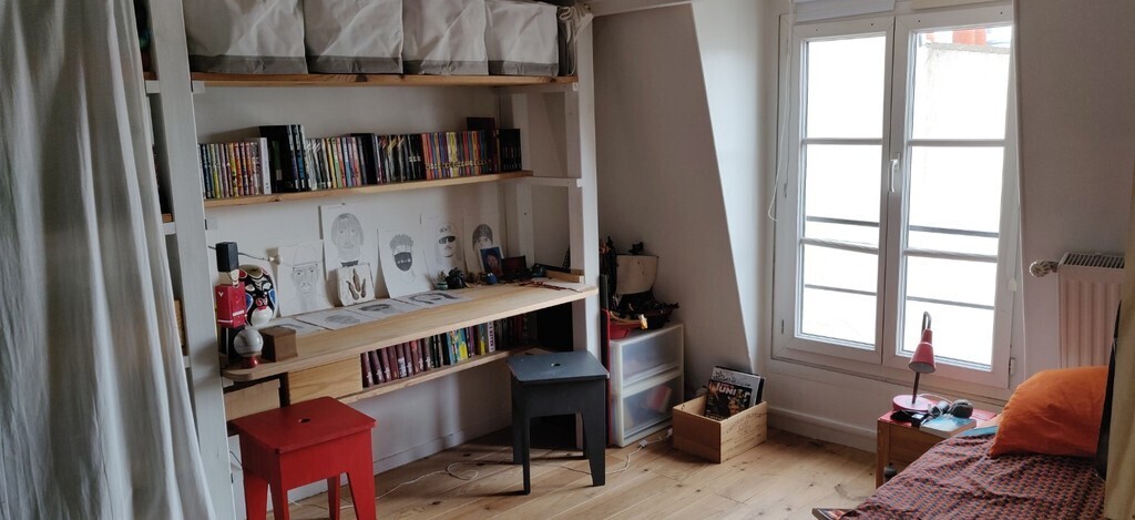 The flat is in the sixth floor of a tipical haussmanian building (end of XIXe century, but without lift) ; there are 2 bedrooms : one bedroom with a double bed in mezzanine, a small living room and a desk, the second bedroom with two single beds in two mezzanine and a games area with a small sofa. This small sofa can be used as a bed for a young child. In the flat, there are also a living room room with the kitchen, one bathroom and wc.