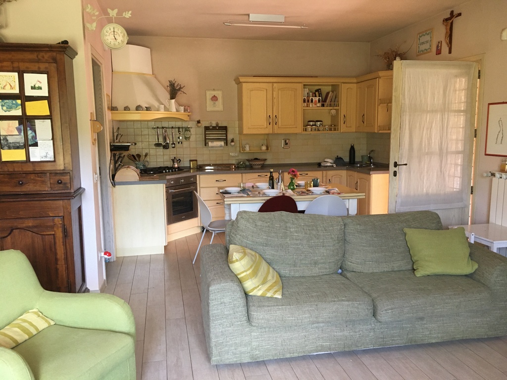 È una porzione di fienile su tre piani,con zona giorno al piano terra con accesso diretto al giardino.